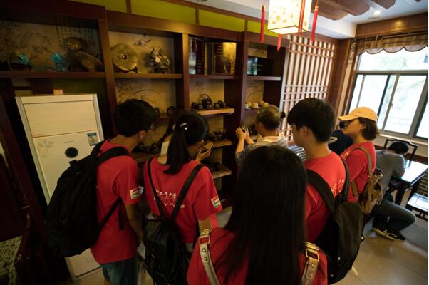 下午四点半,团队指导老师、宣城校区党政办公室霍效忠主任亲自驱车赶往敬亭山,与敬亭山管委会相关领导会面,双方进行了深入友好交流,均表示要加强合作,努力将暑期实践活动搞得有声有色。随后,在徐衡苹副主任的带领下,霍主任与团队全体成员一起攀登敬亭山,并重点参观了山上的茶楼。在茶楼中,徐主任向团队成员具体介绍了各种茶具的历史渊源和不同功能,并解读了其背后的文化内涵,增长了大家的见识,拓宽了大家的视野,为活动增添了新的创新思路。下午五点半,参观活动在热切友好的氛围中结束。