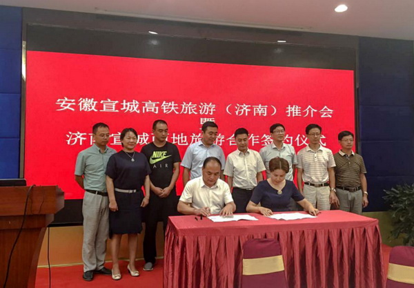 为加大京福高铁宣城旅游宣传营销,开拓山东旅游市场,近日,由宣城市旅游发展委员会牵头在山东济南举办高铁旅游宣传推介会,宣城市敬亭山管委会委派敬亭山旅游投资有限公司副总经理夏天和童雅琴参加本次推介会。 推介会上,济南、宣城两地开展了丰富多彩的交流活动,宣城市敬亭山旅游投资有限公司营销副总经理童雅琴对敬亭山进行了景区特色推介。市旅发委负责人代表宣城景区签订了济南宣城旅游合作交流框架协议。