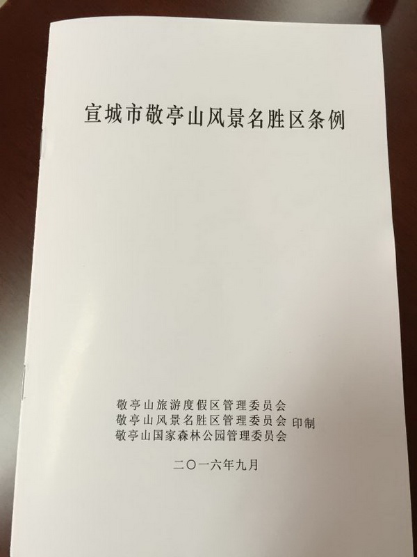 会议指出,《条例》于2016年5月31日经宣城市第三届人民代表大会常务委员会第三十四次会议通过,2016年7月29日经安徽省第十二届人民代表大会委员会第三十一次会议批准,《条例》自2016年10月1日起施行。《条例》对景区的规划建设、保护、管理法律责任等作出了明确规定,它的出台标志着景区的保护管理工作纳入规范化、法制化轨道,对敬亭山风景区保护与管理具有里程碑的意义。