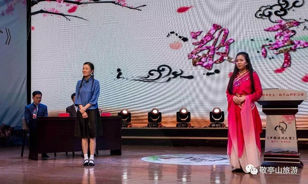 飞花令表演赛邀请先后登上央视《中国诗词大会》第一季、第二季擂台的陕西才女陈更与在第二季第六、第九场次中先后攻擂的辽宁美女王冬妍,展开“飞花令”的对抗,本次活动飞花令不是一个字,而是“敬亭”二字,不过也是难不倒我们两位才情四溢的美女,对抗精彩纷呈,最终,陕西才女陈更获胜并与吕涵展开最终的冠军争夺赛。