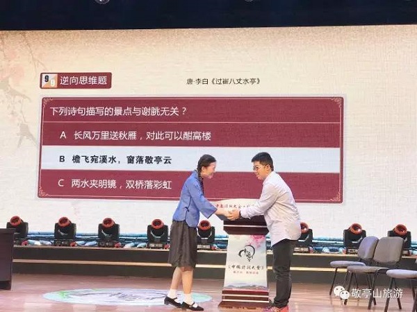 4月22日上午9时,“中国诗词大会——走进敬亭山”特别活动在市广电台演播大厅精彩上演。此次诗词大会由宣城市旅游发展委员会主办,敬亭山旅游度假区承办,以弘扬江南诗山文化为主题,大会邀请第一届中国诗词大会总冠军殷怡航担当本次活动的主持,南京师范大学教授郦波与上海师范大学教授李广定为本次活动现场点评嘉宾,与现场180位诗词爱好者共同畅游诗的海洋,带领我们共同领略敬亭山的魅力。