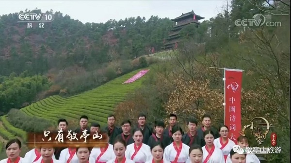 节目一开篇,镜头就从太白独坐楼前飞过,百人团集体吟诵李白的《独坐敬亭山》。太白独坐楼、太白湖等敬亭山著名的景点刷屏央视。作为节目的核心内容,今年的诗词大会选取了汉语言文学史中,最优美、最精华、最值得向观众传播普及的数百篇经典诗词。而敬亭山作为中国山水诗的发祥地,从谢朓的“兹山亘百里,合沓与云齐”,到李白的“相看两不厌,只有敬亭山”的千古绝唱,都将延续《中国诗词大会》的主题:“人生自有诗意”。